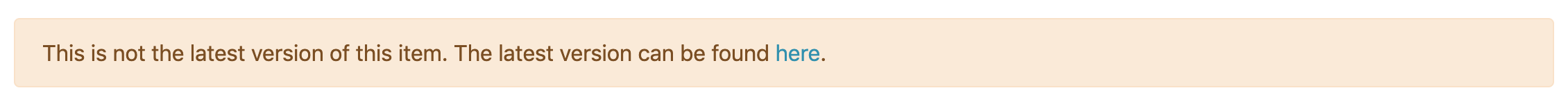 The notice is displayed in a non-dismissible warning alert and reads: “This is not the latest version of this item. The latest version can be found here.” with “here” as a link to the item page of the latest version, as seen in the screenshot below.