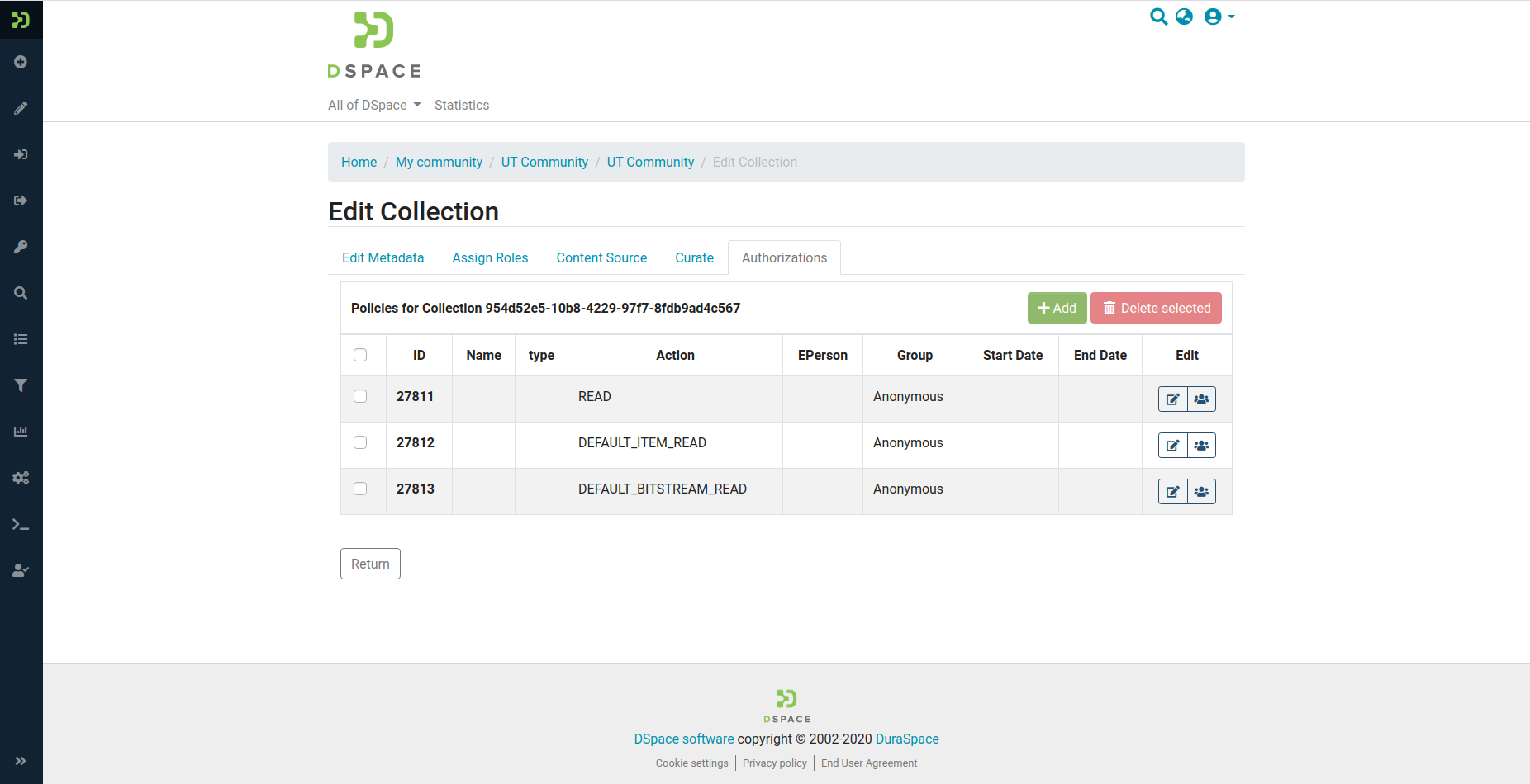 This PR adds implementation for collections/communities resource policy management.