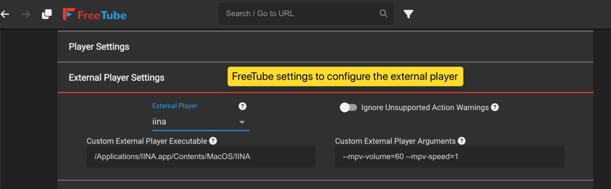 - FreeTube allows the configuration of an external player