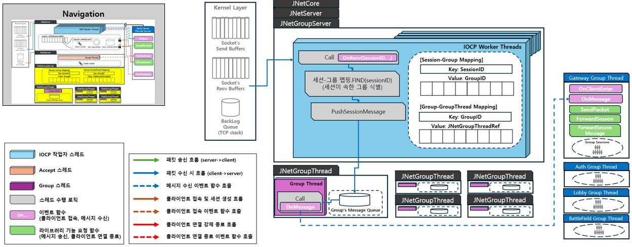 JNetGroupServer 세션-그룹ID 맵핑 / 그룹ID-그룹 스레드 맵핑 자료구조를 통해 세션을 각 그룹에 소속시키고, 각 그룹을 독점적으로 처리하는 싱글 스레드에 배정시킵니다.