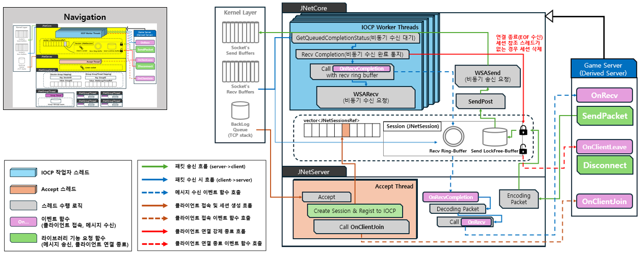 JNetServer 클라이언트의 연결 요청에 대한 Accept를 수행하는 Accept 스레드 관리 클라이언트와의 연결 수립 시 세션 생성 및 연결 소켓을 IOCP에 등록
