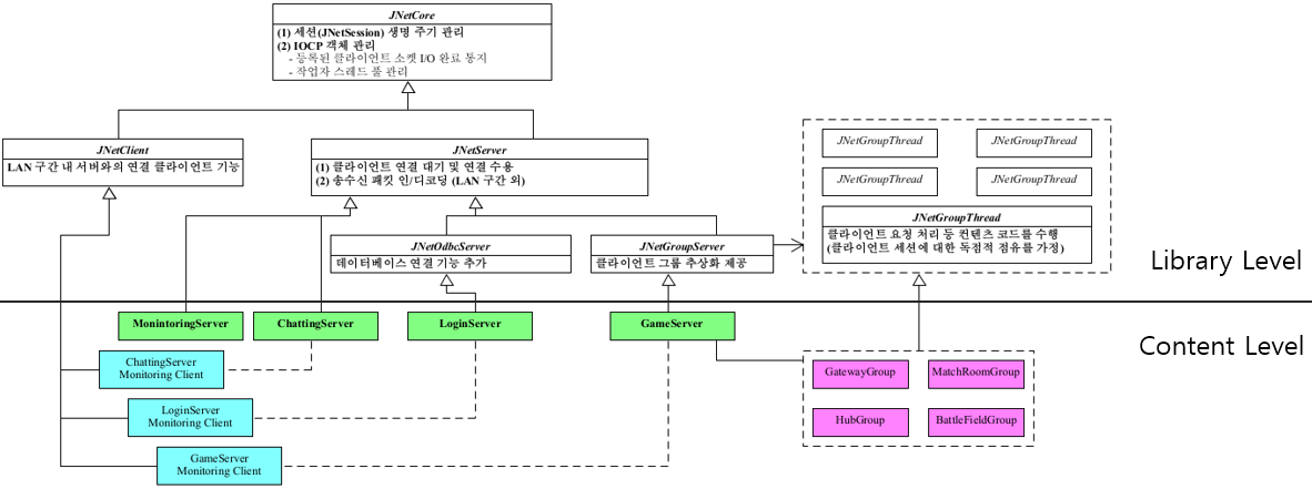 JNetLibrary는 기본적으로 ‘세션 생명 주기 관리’ 및 ‘비동기 I/O 처리’ 기능을 제공하는 최상위 클래스(JNetCore)부터 구체적인 기능(서버 또는 클라이언트 기능, DB 커넥션 기능, 세션 그룹화)이 추가되는 하위 클래스들로 구성됩니다. 또한 LAN 구간 내 다른 서버와 연결되어 클라이언트 역할을 수행할 수 있는 클라이언트 클래스(JNetClient)도 포함됩니다.