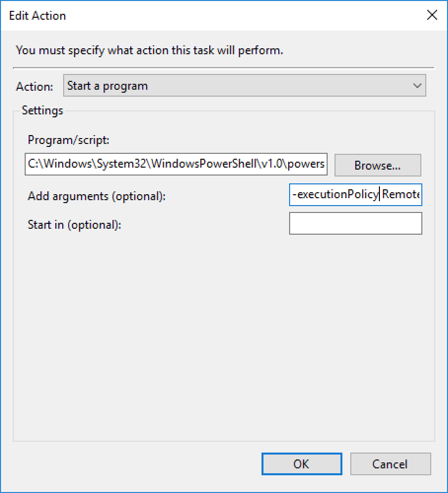 Program/script set to: C:\Windows\System32\WindowsPowerShell\v1.0\powershell.exe