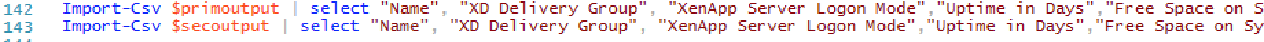 Import-Csv $secoutput | select "Name", "XD Delivery Group", "XenApp Server Logon Mode","Uptime in Days","Free Space on System Drive","IP Addresses","PVS vDisk File Name","Logon Server","Host Name","VM Tools Version","VM Tools Version State" | Export-Csv -NoTypeInformation -Path $morningreportsdir\Part2.csv```