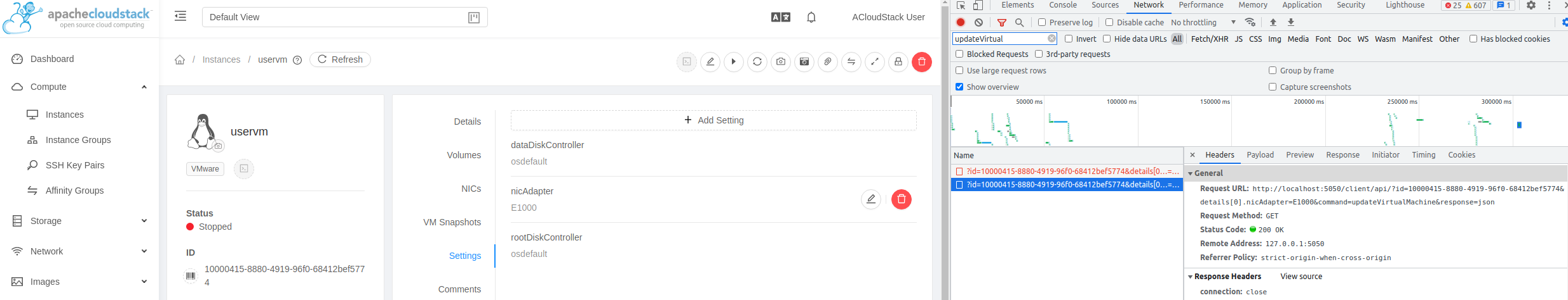 Before fix (filtering of readonly details not working properly and updateVirtualMachine is called with rootDiskController setting)