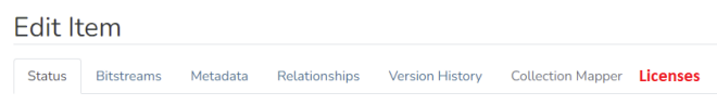 CLARIN-DSpace allows attaching or detaching a license to/from an item or to/from all bitstreams of the item. To the Edit Item view will be added Licenses option: