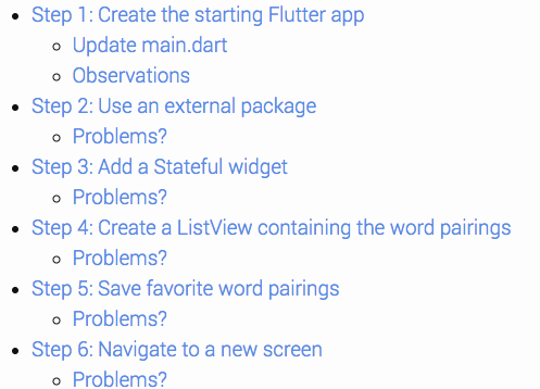 I just went through what's been written so far. Overall, I found it a great first tutorial which covers a lot of ground. My only concern is that many users might not be able to finish the tutorial in one sitting. So we need to help them get back to the tutorial after interruptions. We can do this by linking to the tutorial from the code and linking to different sections from relevant pages on flutter.io and related API docs. In addition, splitting the tutorial into several pages might enable us to track completion rate. SZ: @InMatrix, we should discuss this in person. In the past, when I broke these tutorials into multiple pages, I got pushback. When I convert this to codelabs.google.com for Google I/O, it will be different pages. I like your idea of cross linking, but it requires some thought. |