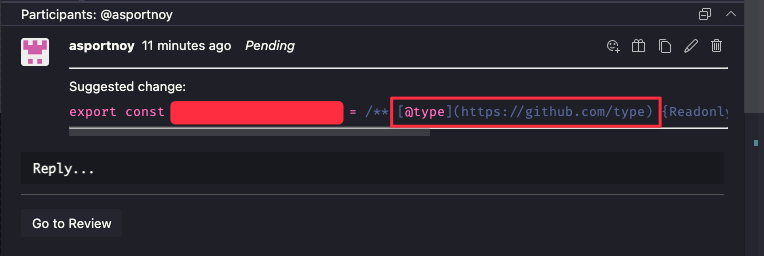 Seems like the extension is treating the @type within the suggestion as a GitHub mention. The comment looks fine on github.com, the extension is just trying to render it as a mention within the code block.