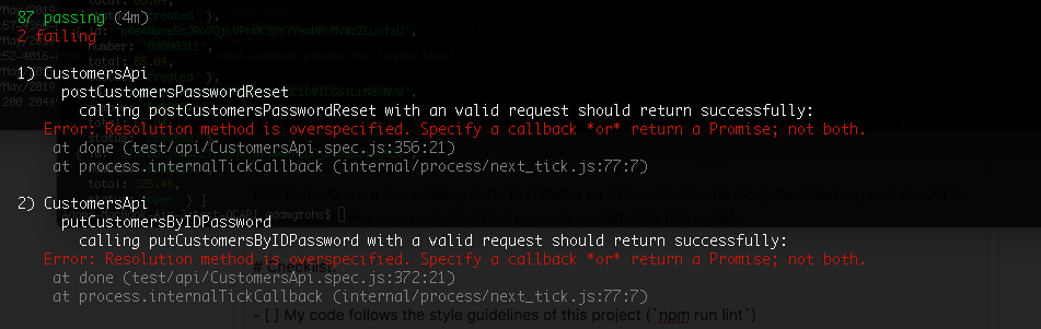 npm run test(including updating from test config in package.json from babel-core/register to @babel/register)IMPORTANT: The following 2 existing tests failed due to coding issues in existing test (CustomersApi.spec.js) that are now flagged by the newer/updated version of "mocha" (Error: Resolution method is overspecified. Specify a callback or return a Promise). I have gone ahead and fixed these two issues but would love an extra pair of eyes on them as they are the only changes I needed to make to the tests in order to pass.