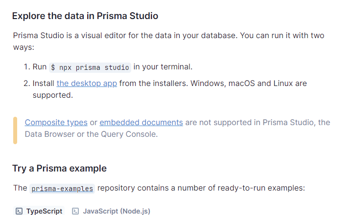 | [Composite types](https://www.prisma.io/docs/concepts/components/prisma-schema/data-model#defining-composite-types) or [embedded documents](https://docs.mongodb.com/manual/core/data-model-design/#std-label-data-modeling-embedding) are not supported in Prisma Studio, the Data Browser or the Query Console. | |