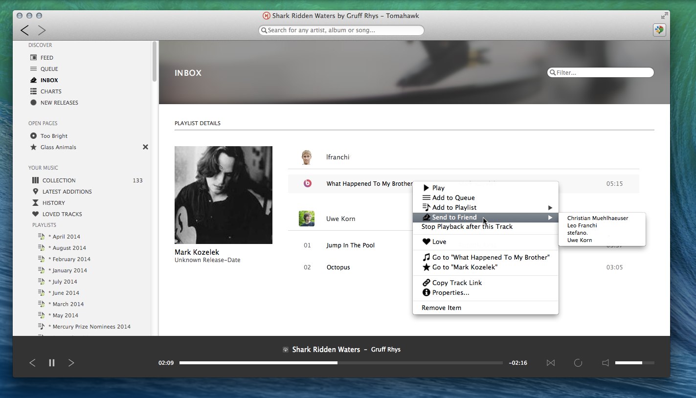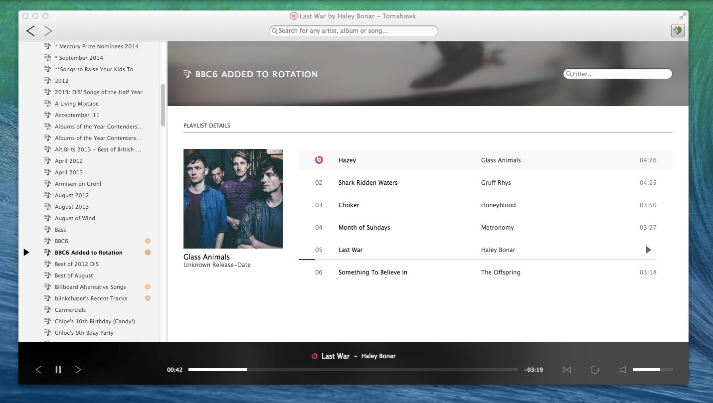 Tomahawk is a free multi-source and cross-platform music player. An application that can play not only your local files, but also stream from services like Spotify, Beats, SoundCloud, Google Music, YouTube and many others. You can even connect with your friends' Tomahawks, share your musical gems or listen along with them. Let the music play!